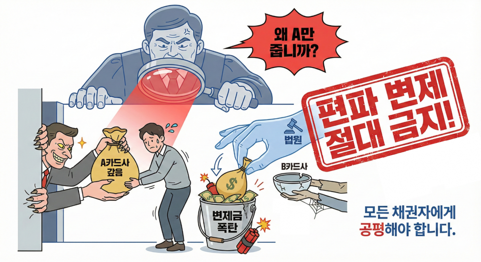 편파변제란, 여러 채권자가 있는데 그중 특정 채권자에게만 먼저 돈을 갚는 행위를 말합니다. 법원은 원칙적으로 모든 채권자를 공평하게 다루는 것을 중요하게 봅니다.