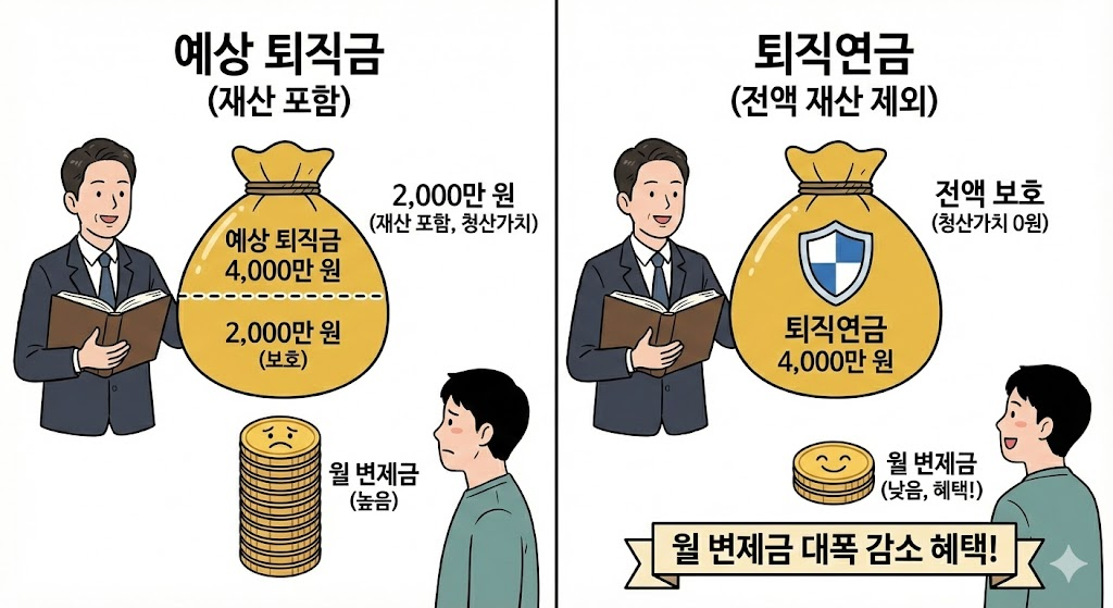 이 차이는 생각보다 매우 큽니다. 똑같이 4,000만 원이 적립되어 있다고 해도, 일반 퇴직금이면 절반인 2,000만 원이 재산으로 반영될 수 있지만, 퇴직연금이라면 전액이 재산에서 제외될 수 있습니다.