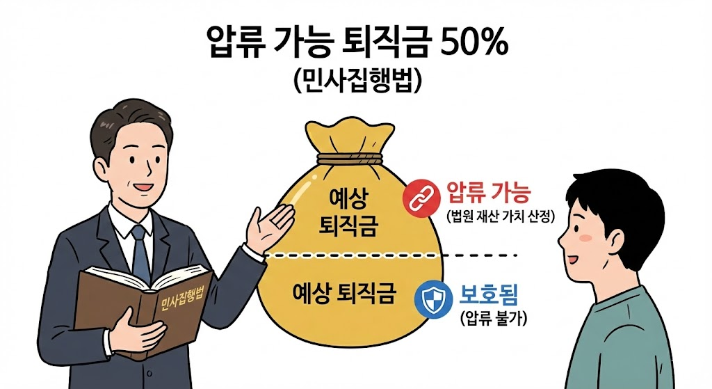 민사집행법상 퇴직금은 50%까지만 압류 가능하므로, 개인회생 실무에서도 보통 예상 퇴직금의 절반만 재산 가치에 포함시키게 됩니다.