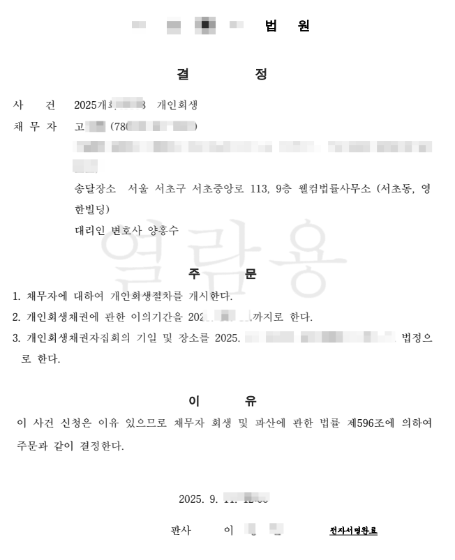 또한 개인회생 신청 이후 약 2개월 만에 관련 결정이 내려지면서 비교적 빠른 절차 진행이 이루어졌습니다.