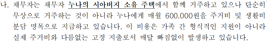 의뢰인은 친가가 아닌 누나의 시부모님 가정에서 생활하고 있었기 때문에 식비, 공과금, 생활비 등을 일정 부분 분담하는 것이 현실적으로 불가피한 상황이었습니다. 또한 성인 남성이 3대가 함께 거주하는 환경에서 일정 수준의 생활비를 부담하는 것은 일반적인 생활 구조라는 점을 설명했습니다.