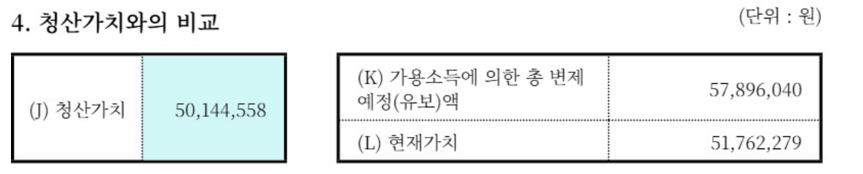 개인회생을 진행하면서 가장 큰 문제로 떠오른 것은 청산가치 보장 원칙이었습니다. 의뢰인은 본인 소유 부동산과 식당 임차보증금이 있었기 때문에 재산 가치가 약 5,000만 원 이상으로 평가되었고, 이는 변제계획을 설계하는 데 중요한 기준이 되었습니다.
